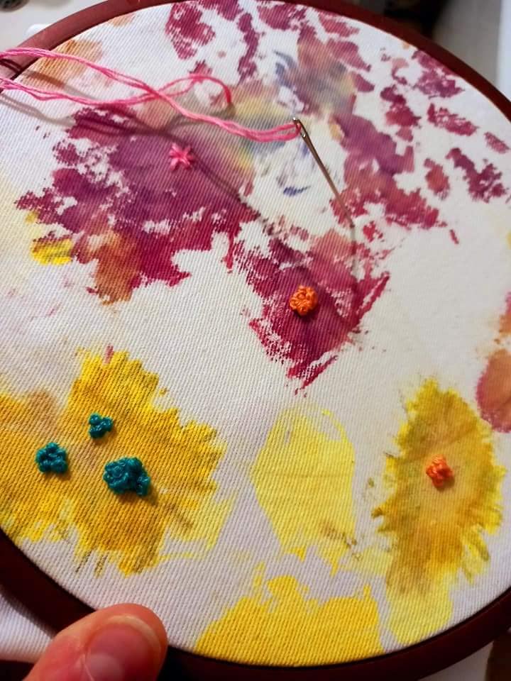 Pânza noastră pe care s-au imprimat culorile florilor de primăvară si pe care am început să și brodăm, pentru a o împodobi, am gândit-o sa fie folosită pentru confecționarea unui huse pentru sticla de apă si pentru un penar simplu de voiaj pentru creioane colorate.