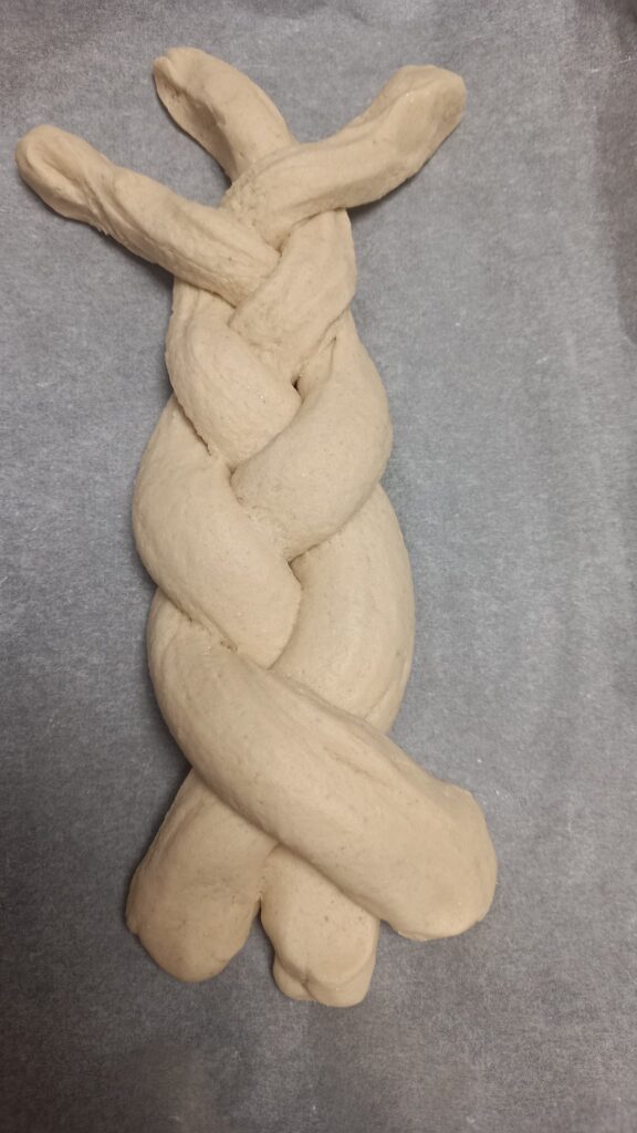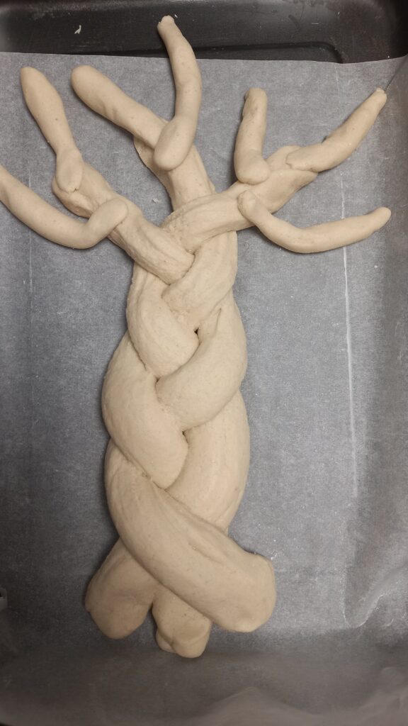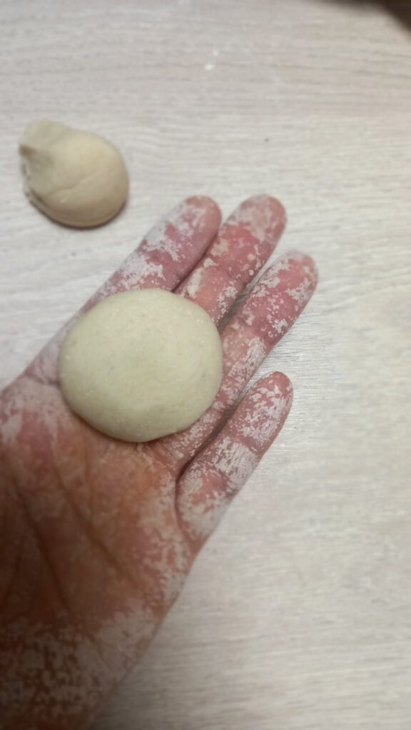 Pas 2: Prima jumatate de aluat împarte-o in trei si modeleaza „cârnăței”, pe care ulterior îi vei împleti.