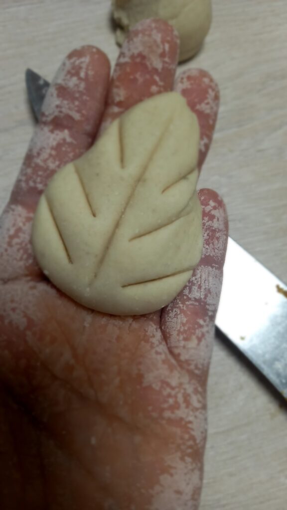 Pas 4: Pentru realizarea frunzelor, modelează cel putin 6-7 „mingiute”. Alungeste-le la varf, piscându-le cu degetele, apoi cu un obiect subtire (scobitoare) creează nervurile frunzelor, apăsând pe aluat pentru imprimare.