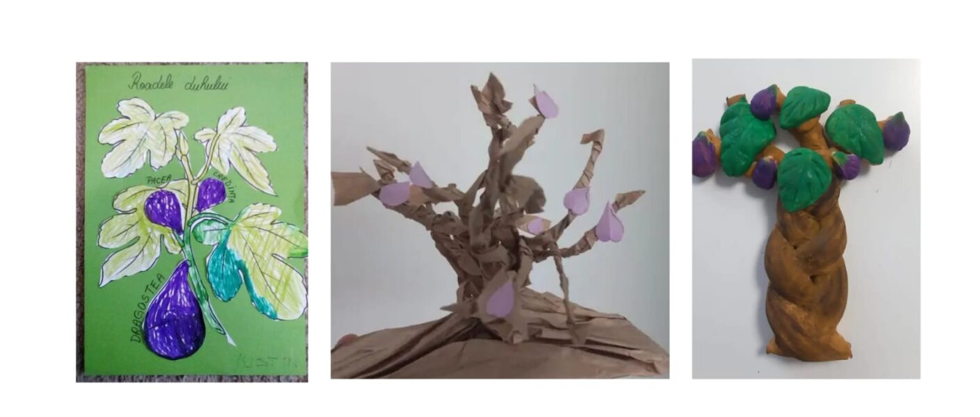 1. Inspirați de Evanghelia smochinului neroditor, în 2018, când copiii aveau 5 și 3 ani, am realizat un smochin dintr-o pungă de hârtie și am completat activitățile cu studiul botanicii, după metoda Montessori.