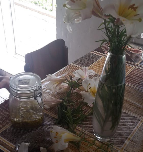 La prepararea apei de crini m-a ajutat și Ecaterina care se trezise între timp. Ea a rupt petalele crinilor și le-a tăiat cu foarfecele. Am folosit mai mult de 10 crini, tot ce mai rămăsese ăn grădină și a ieșit o sticlă la fel de mare ca cea a apei de trandafiri.