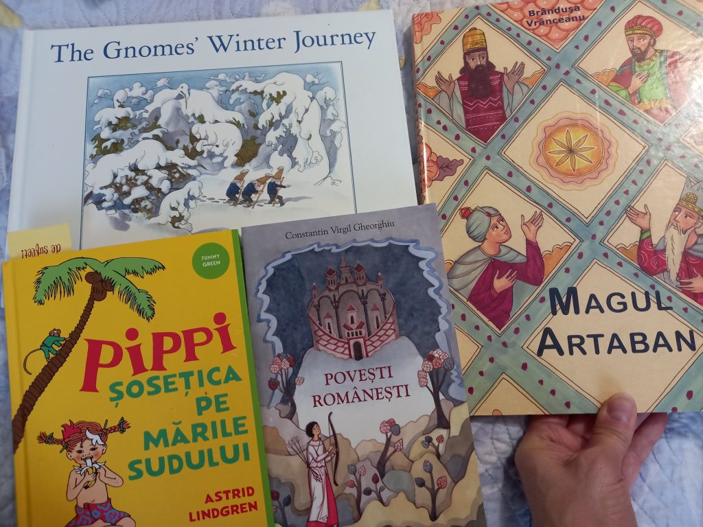 As fi vrut sa citim pana la Craciun toate cartile din biblioteca ce acopera subiectul, dar nu a fost sa fie. Nu reusesc sa-i adun la ascultat. Doar intr-o singura seara am citit din cartea Magul Artaban de Brandusa Vranceanu, ed. Nepsis; o carte minunata despre un al patrulea mag ce a pierdut intalnirea cu prietenii sai si a ratacit 33 de ani cautandu-l pe Iisus Hristos. Daca nu o aveti, dati fuga si luati-o, pentru ca e emotionanta. Intr-o alta seara am citit The Gnomes’ Winter Journey. Eu m-am bucurat si de cartea Pamelei Dalton, de ilustratiile ei minunate, dar ei nu au avut rabdare sa stea sa asculte textul.