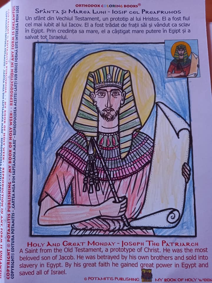 Copiii au ales să coloreze icoana lui Iosif cel Preafrumos si a hainei colorate a lui Iosif, cea pe care o primise in dar de la Iacov. Icoana este din cartea editurii Potamitis, Activitățile mele din Săptămâna Mare.