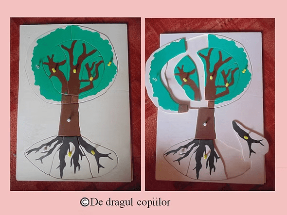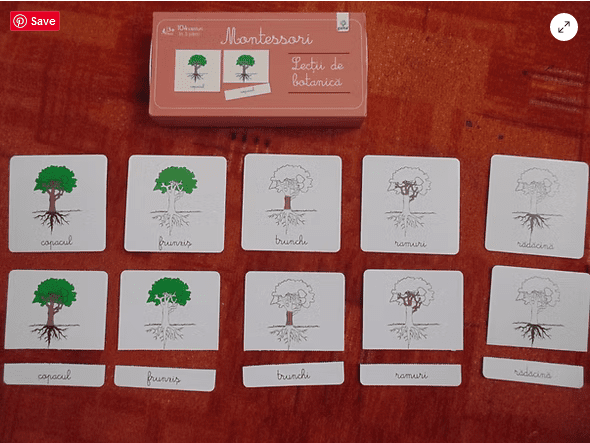 Mai jos sunt setul de cartonașe de nomenclatură Montessori: Lecții de botanică, de la editura Gama, accesibile copiilor cu vârste între 3 și 6 ani și puzzle-ul de lemn cu părțile unui copac, pe care la vremea respectivă l-am creat pentru copii.