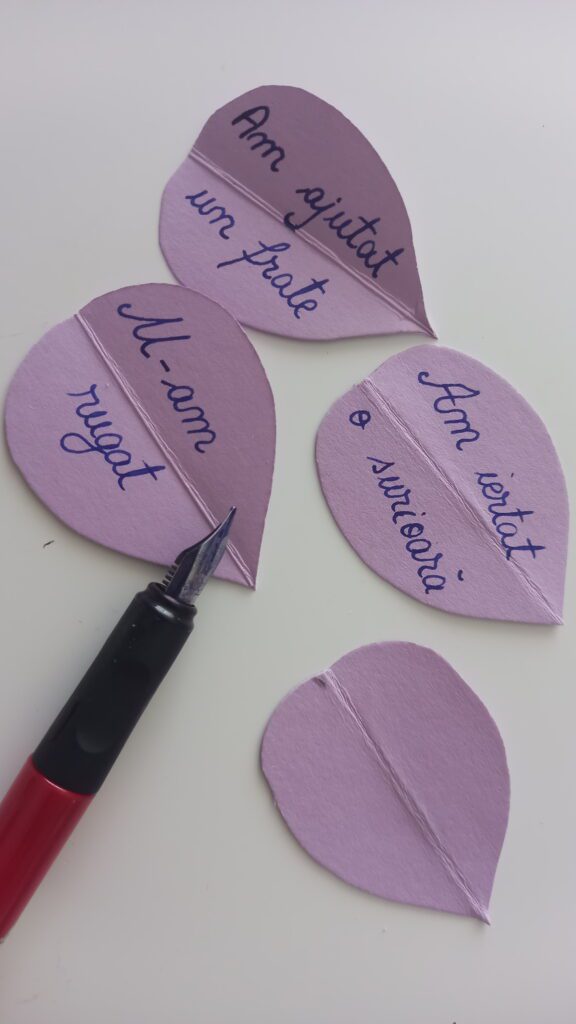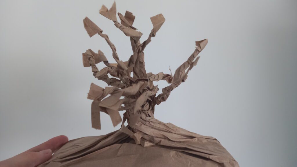 Mai jos sunt pașii realizării unui copac din punga de hârtie. Smochinul este la final decorat cu smochine din carton colorat, pe care notăm faptele bune pe care le facem zilnic, încurajând astfel și un comportament dezirabil.