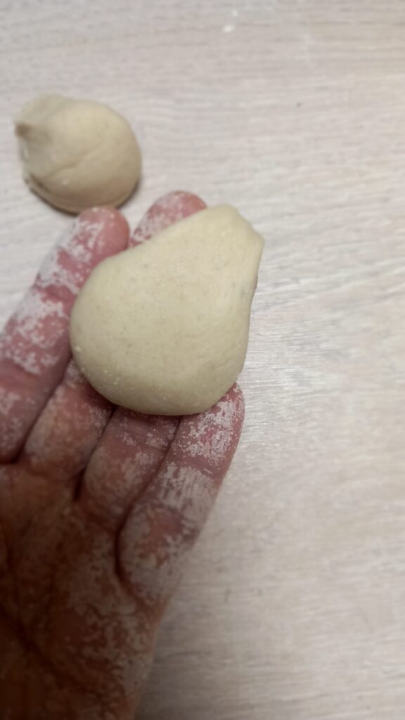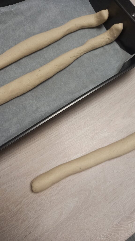 Pas 2: Prima jumatate de aluat împarte-o in trei si modeleaza „cârnăței”, pe care ulterior îi vei împleti.
